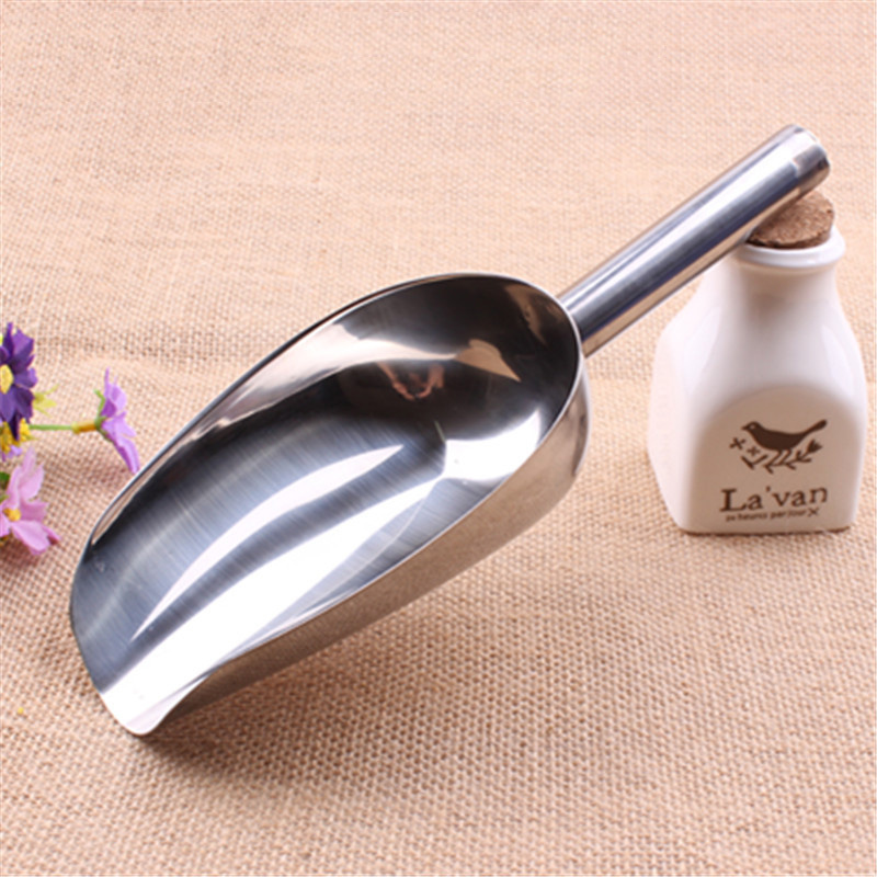 This stainless steel scoop is perfect for scooping ice cubes, dry goods, sugar, candy, popcorn, coffee beans, rice, grain, flour, pet food, etc.