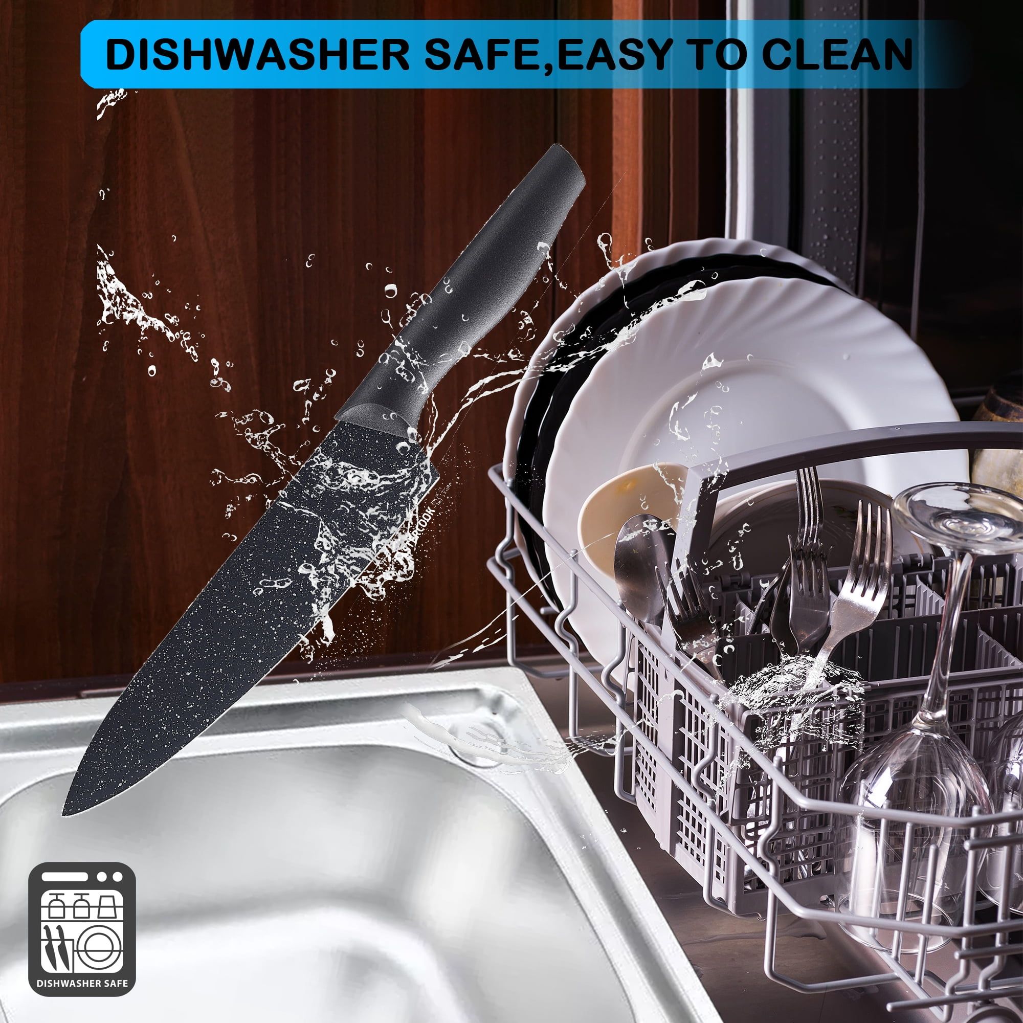 Dishwasher Safe: The kitchen knife set is made of premium stainless steel with a non-stick black finish, allowing for both hand and machine washing.